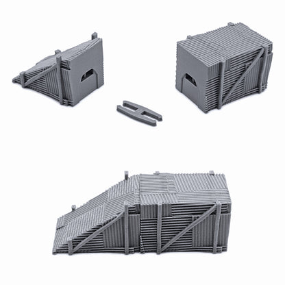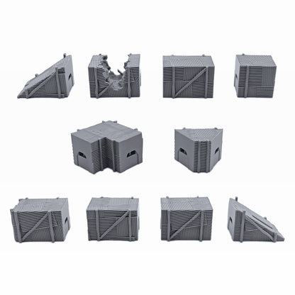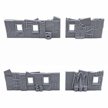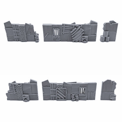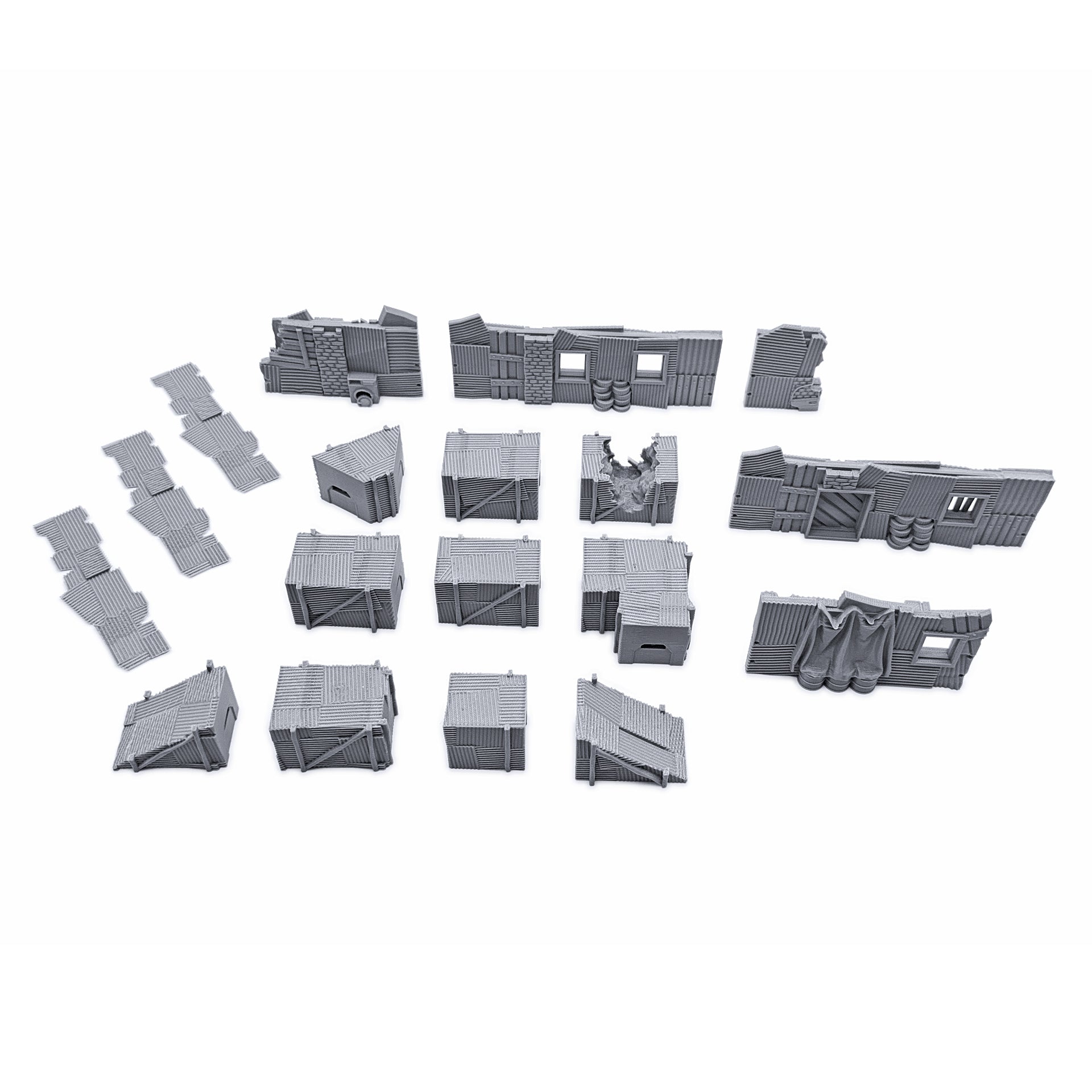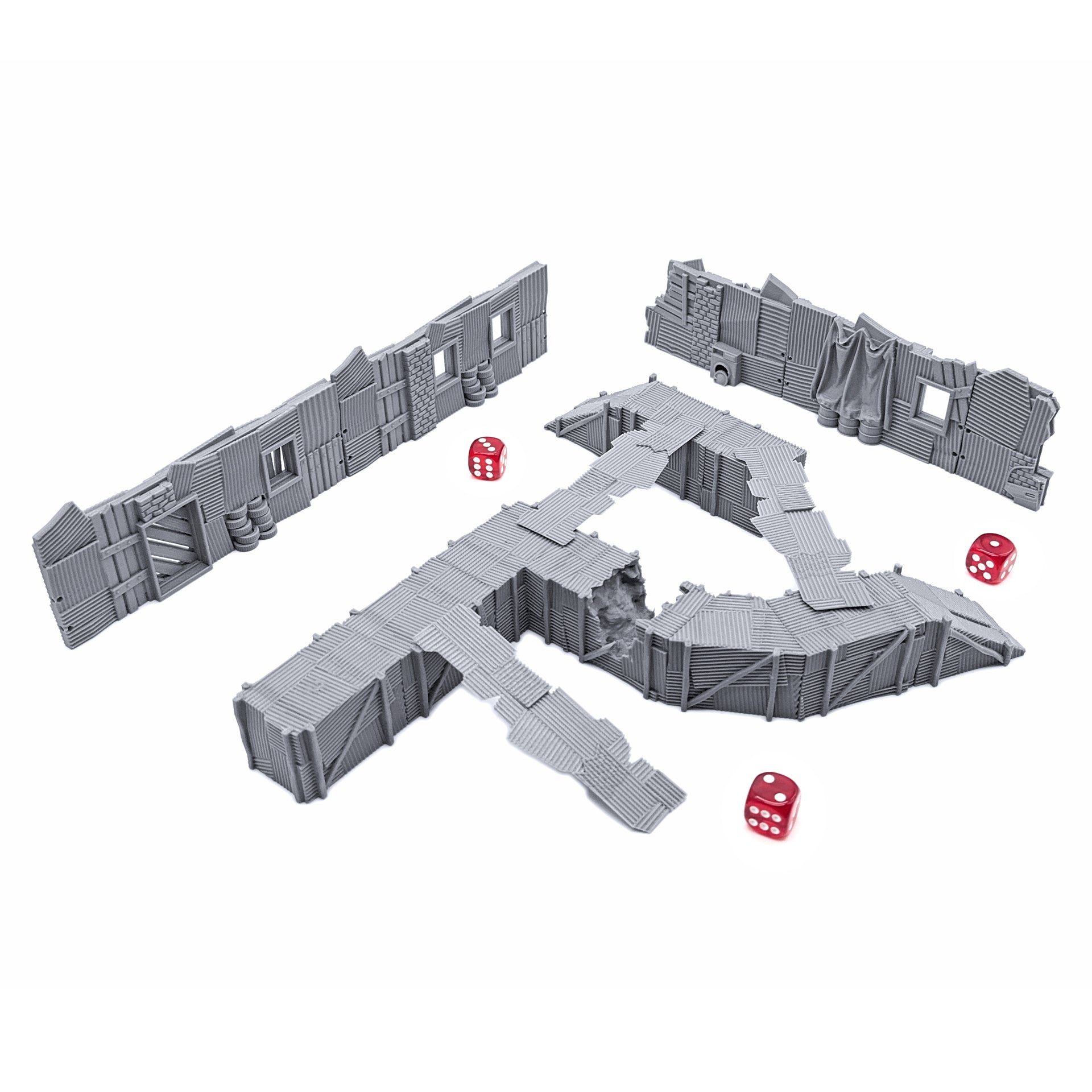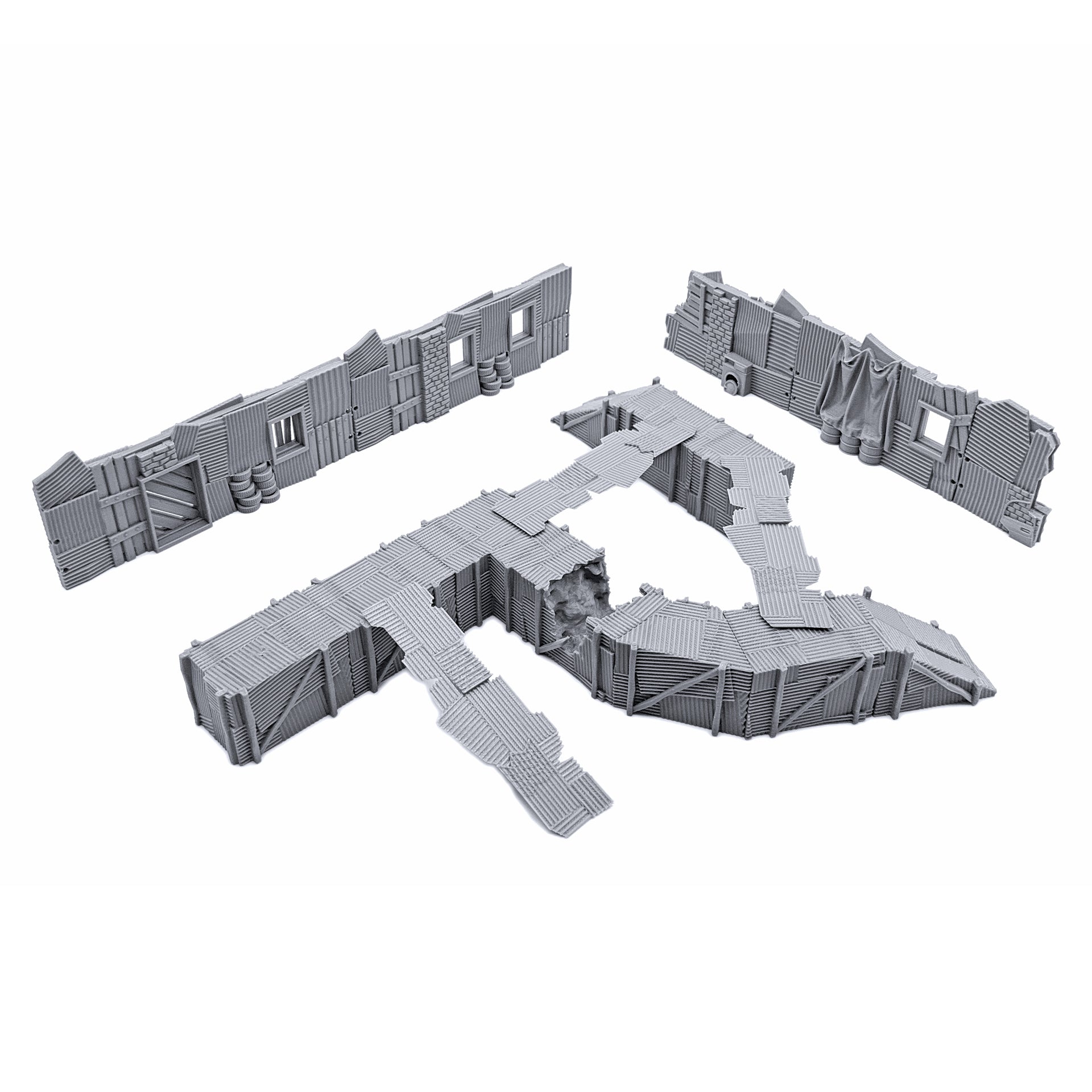 - Great value! Set includes 18 pieces of modular junkyard skirmish terrain walls and raised pathways.