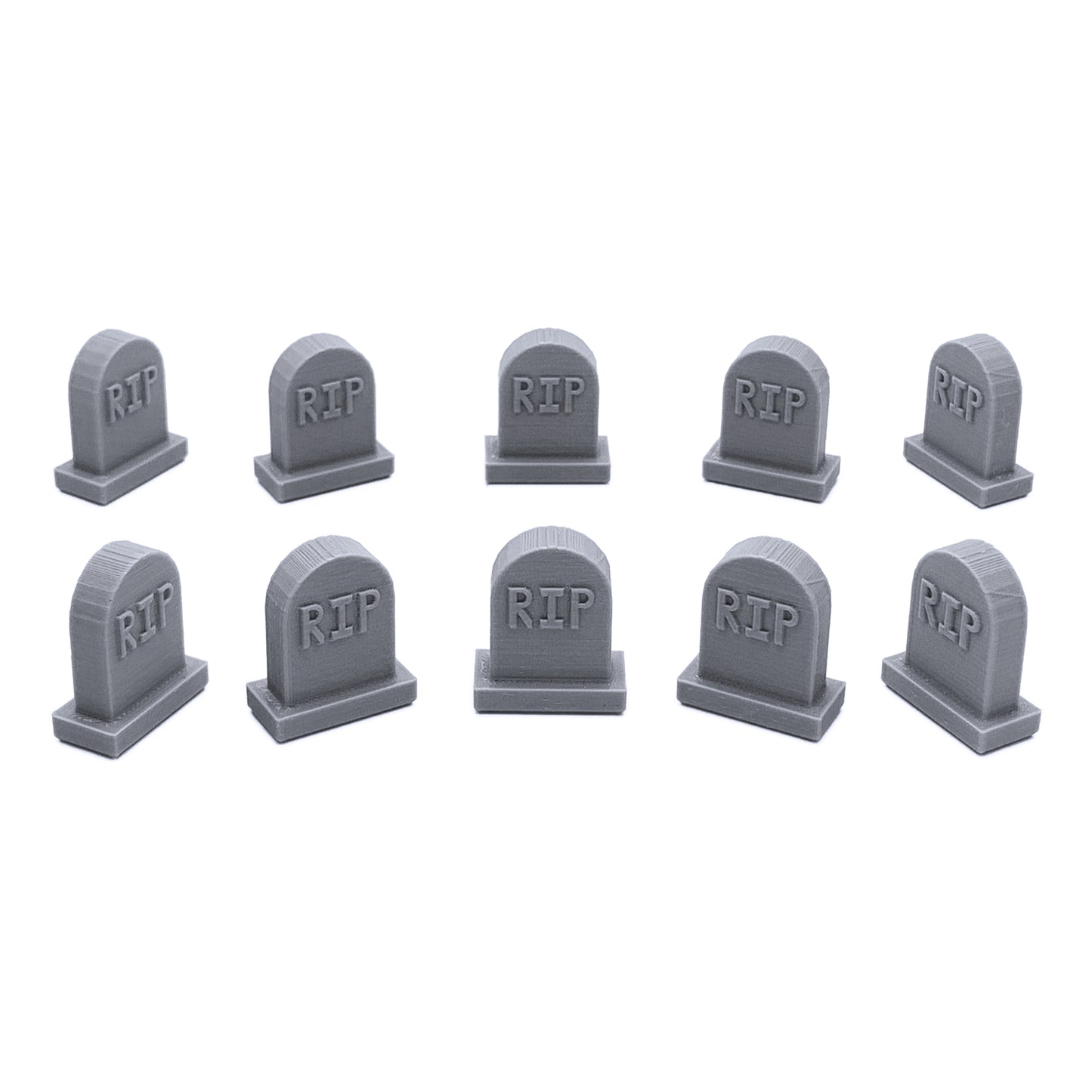 - RIP Gravestones (10pcs); 13 x 26 x 31mm = 0.5 x 1 x 1.2"