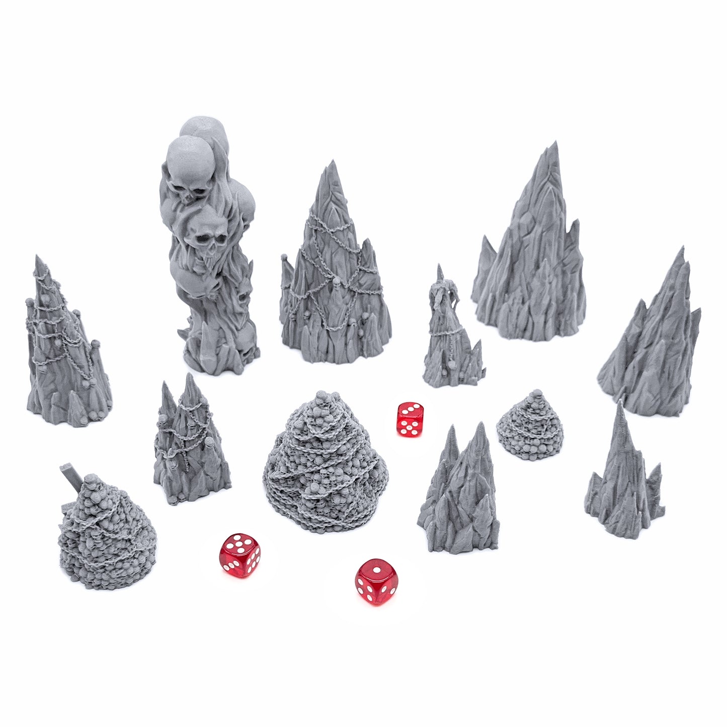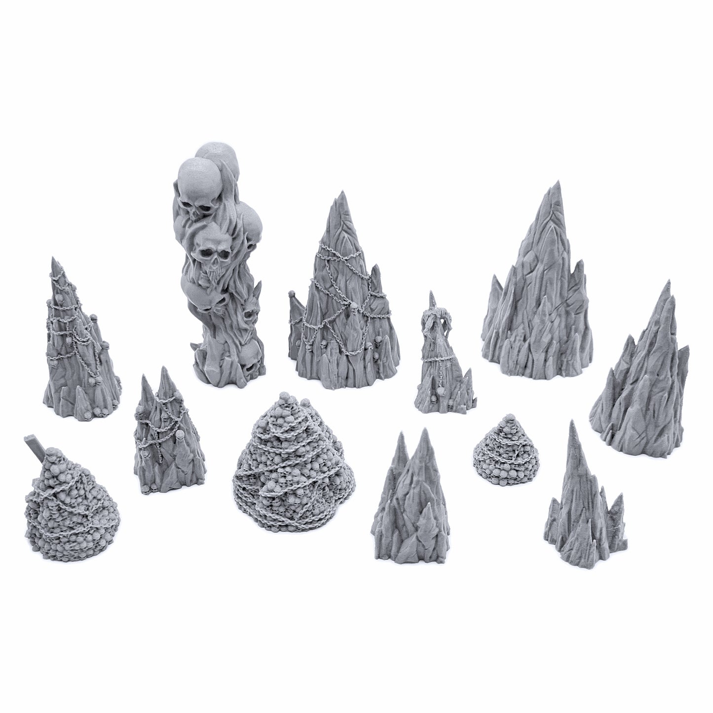 - Great value! Set includes 12 unique pieces including demonic realm rock formations and skull mounds of varying sizes.